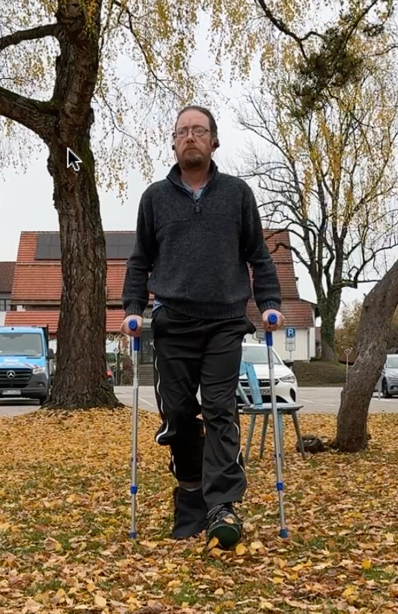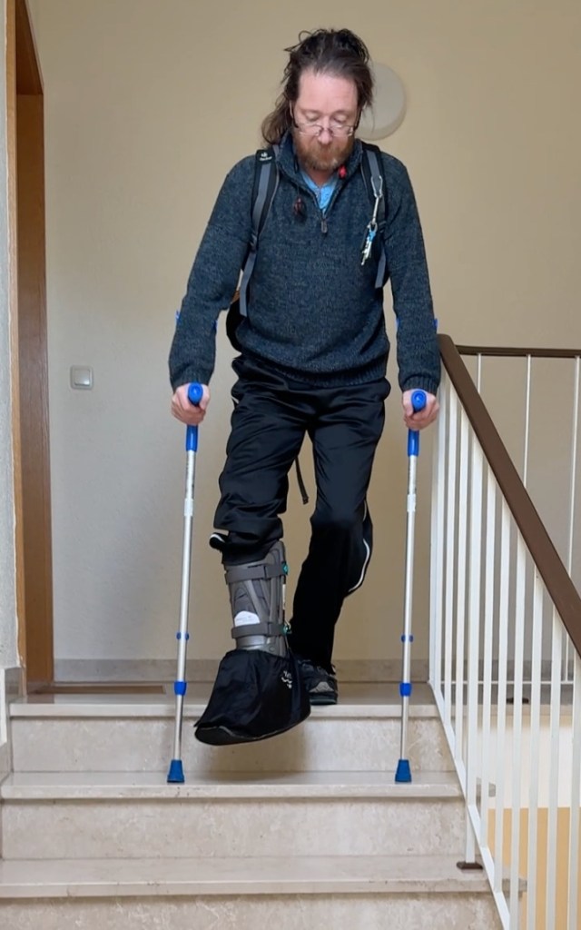 Oh yes … walking / going up stairs on crutches / in a 30 degree fixed VACOped boot – you have to be careful on the stairs … but at the end of the day, normal stair walking is also a dynamic movement, just one you’ve been doing for decades; take it slow and easy, deliberate placement of the crutches and conscious dynamic movement and you’ll be fine (particularly if you do it next to the handrail … just in case!); I also revisited the park bench from last weekend to take another short video of me simply walking … figure it may well be interesting to see that progression over the next weeks / months (years?).