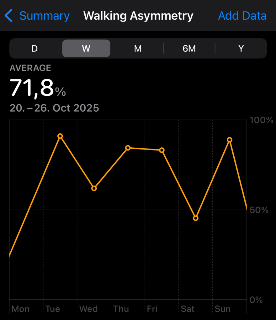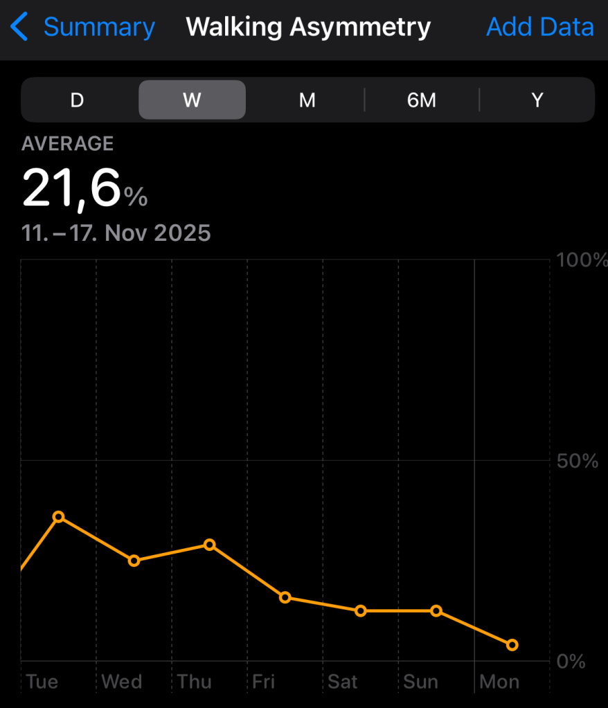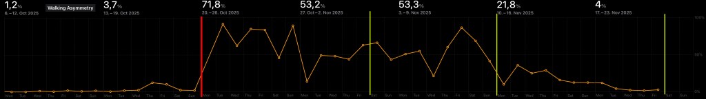 Monday: Forgot a few things from last week … one of them, my walking asymmetry (as measured by my iPhone 16 pro in my pocket – no iWatch). Apple states: “In a healthy walking pattern, the timing of the steps you take with each foot is very similar … uneven walking patterns, such as limping, can be a sign of disease, injury or other health issues. An even or symmetrical walk is often an important physical therapy goal when recovering from injury.” (note: so this doesn’t measure actual symmetry in the complete sense, rather just the timing of the steps, as I interpret and observe it).