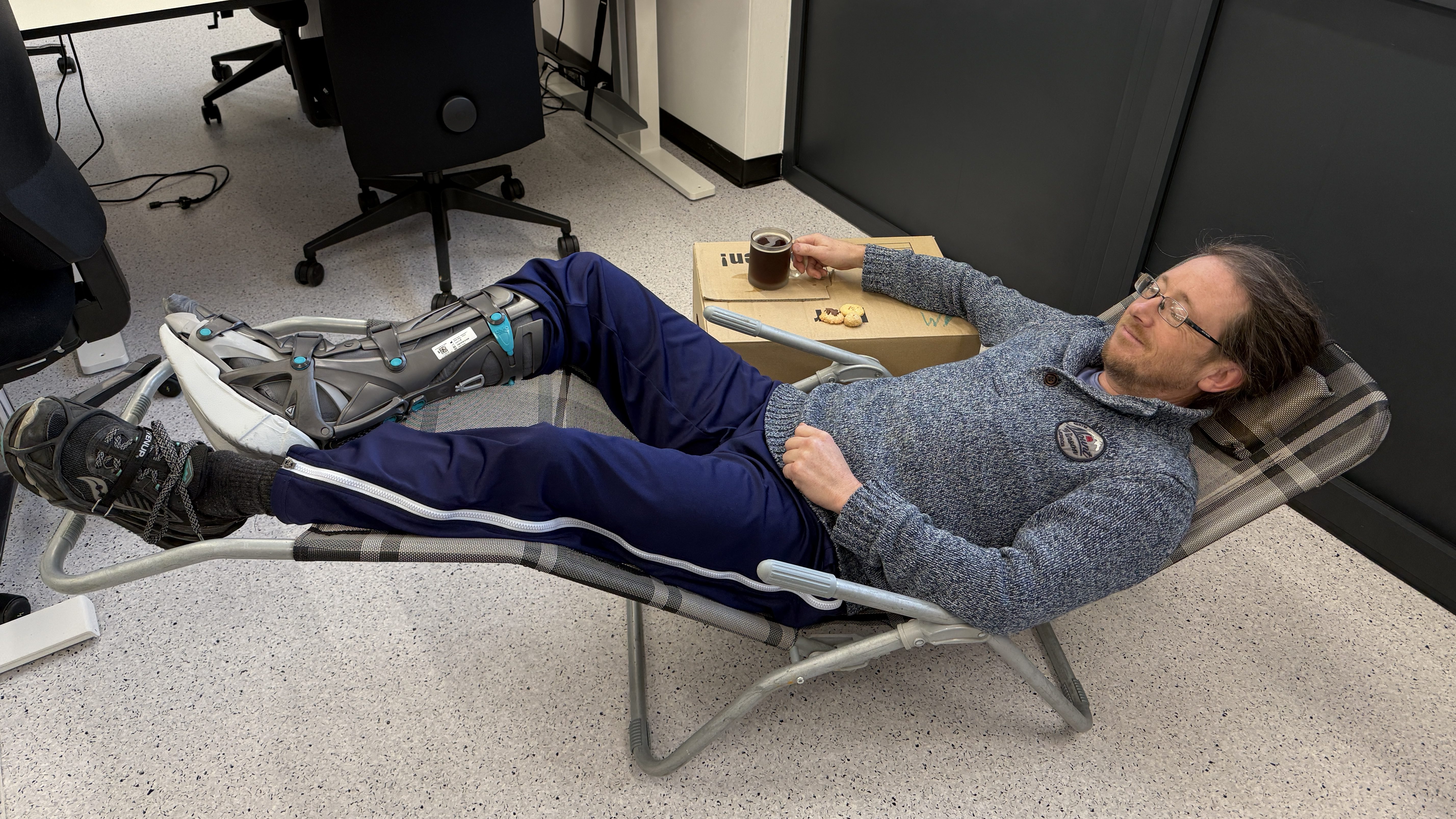 Sunday: So … the 5° extra ROM on the VACOped? Turns out … it is actually (subjectively at least) a HUUGE difference. I had to dial it back; opened it up today again, but only after I’d been for a walk in the sun – 1.5km on the 25° setting, no crutches, no problem; inside on the 20° setting, one step feels like I’m going in the direction of imminent re-rupture. Hard to describe … but it just pulls on the calf and tendon about 10 times stronger than on the 25° setting. So I resorted to using both crutches again to take maybe 30-40% of my weight … and take small steps … and then it was handleable. Did a couple of hundred steps like that in the appartment then turned it back, again, to 25°. Cannot imagine what it would be like to go from 30° to 15° in one step … and I actually have a gel heel insert which probably softens it a little as well. That was sobering. And I expect it’s going to get progressively worse with each 5° 😬.