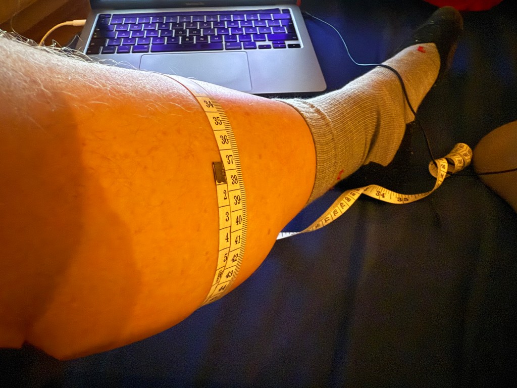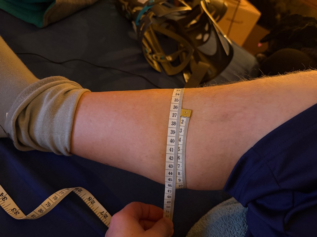 Once the food was all prepared, I put my feet up – despite frequent rests, I really notice my foot swelling, which drives me to the comfort of my bed … boot off, massage the foot, ROM movements and airing. And then I remembered I’d asked my daughter to bring a tape measure – I was interested to see what kind of measurable atrophy had my calves already … approx. 1cm on the circumference -> 3%. Is that usual for 4 weeks … ? Of course, as the bone stays the same, subcutaneous fat too, that obviously represents a much larger percantage atrophy for the affected muscles 😔.