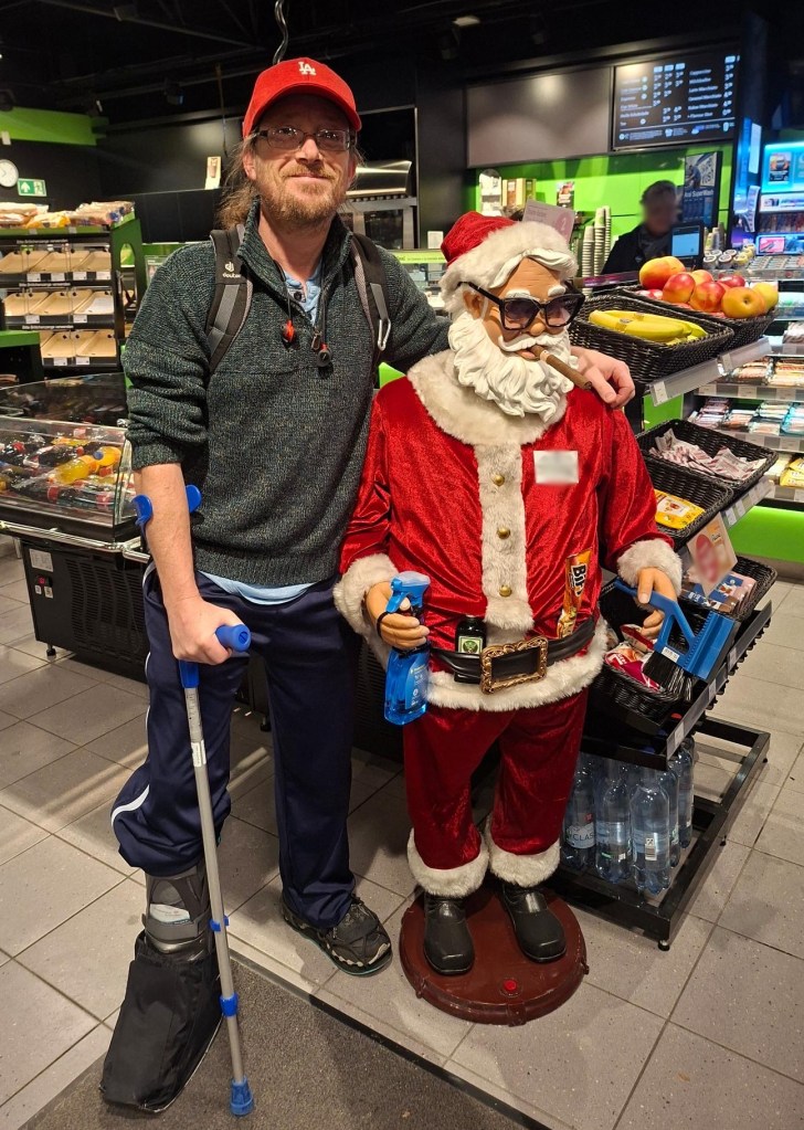 One last funny moment of today was when my eldest daughter (30) brought my youngest son (15) back from visiting a cats’ hospice; I ‘piloted’ her to a parking space (snowy, not so easy here) then we wandered down to the local gas station … and discovered a ‘new Bavarian interpretation’ of Santa Claus – with cigar, Jägermeister (in his belt!) and all.
