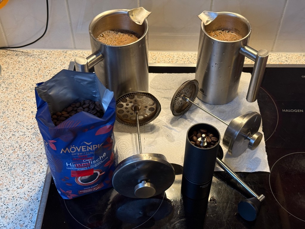 This means I manually grind the coffee beans and brew the coffee in a french press (2 if there are visitors). This all makes drinking coffee a much more conscious act and automatically limits how much I drink; I use a kettle with a settable temperature (use 90° for coffee water) … this also has a positive side effect: less limescale deposited on the inside (we live in a very hard water area) as the water doesn’t boil.