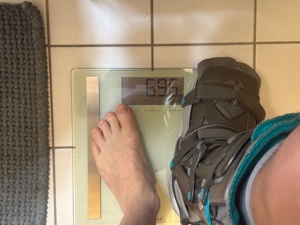 Not quite a ‘net’ weight today: boot, as always, weighing in at around 1.7kg; on top not naked or ’empty’ like I would usually weigh myself in the morning ๐ … so I’d say around 67.5kg.
