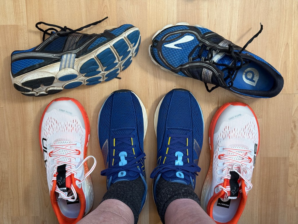 I, however, had thought, ahh … they’re still good enough! Turns out, not so much – the theoretical 6mm drop is probably half of that; the worn out soles (which are no longer waterproof any more) are so run down that they’re perhaps even part of the reason the ball of my toe is hurting … certainly taking steps in the new shoes hardly hurts at all – being stiffer, I guess they spread the load more.