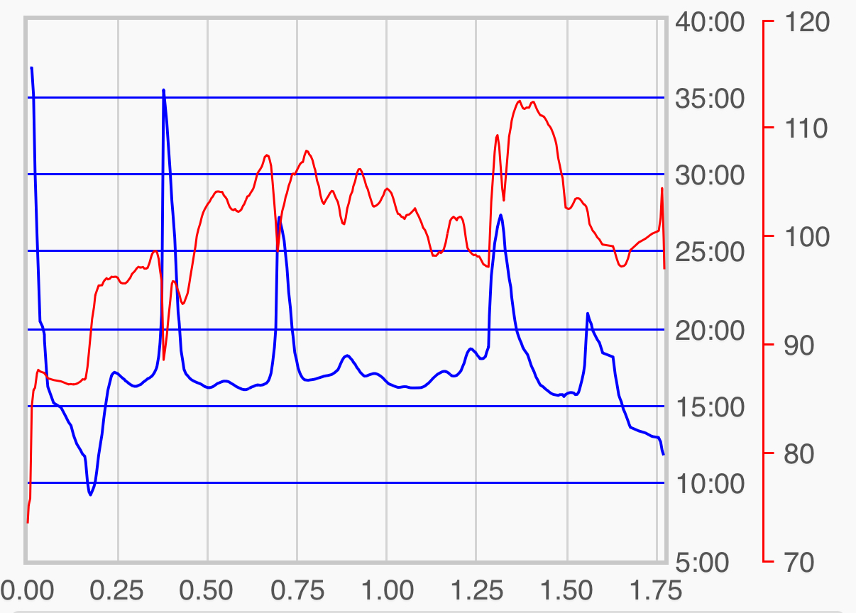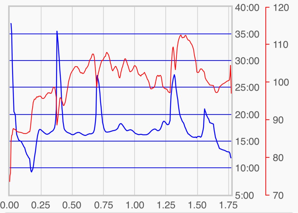 Now, the walk to the train station … well, it’s not like the ‘Street of Doom’, but ‘soothing’ is also not a word I’d use to describe it: the last few hundred metres are a fairly steep uphill climb (that’s the 1.25-1.50km stretch in the screenshot). And the tendon is not ready for that level of tension/dorsiflexion -> doubling down on weight bearing on the crutches, the affected foot not even trying to follow through – gait on pause. Hard work with that blimmin 15kg rucksack … buuut let’s not whine, it’s doable, just hard work – my sports app says I burned over 250 calories on the way (based on my body stats plus pulse) so there’s that ๐ !