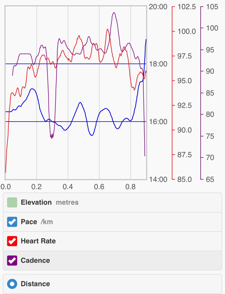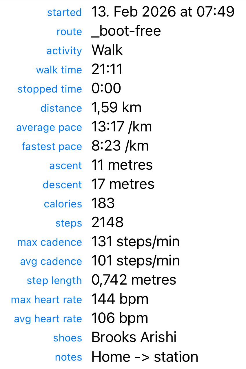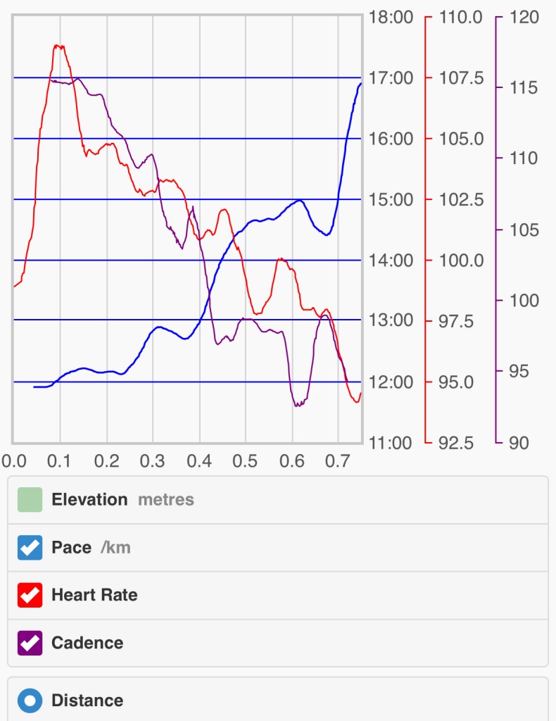 I need 300-400m in the morning to even vaguely warm up (start out with 40-50cm slooow steps); by the time I get to my partner’s (900m or so), I’m finally loosened up. Then I sit down, have a coffee, and today, it was then time to walk back with our little doggo … and holy shit, it’s like back-to-friggin-basics. Still, at least it’s improving, if slowly – gotta stay positive about that.