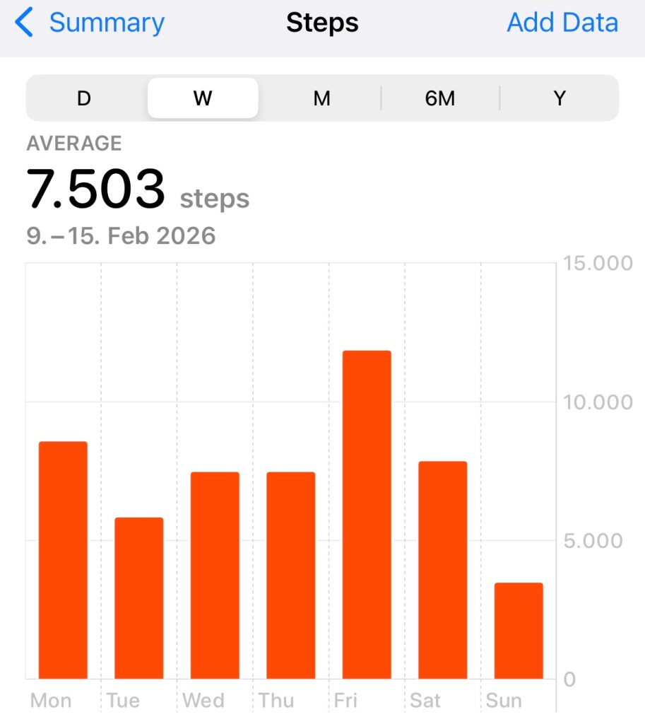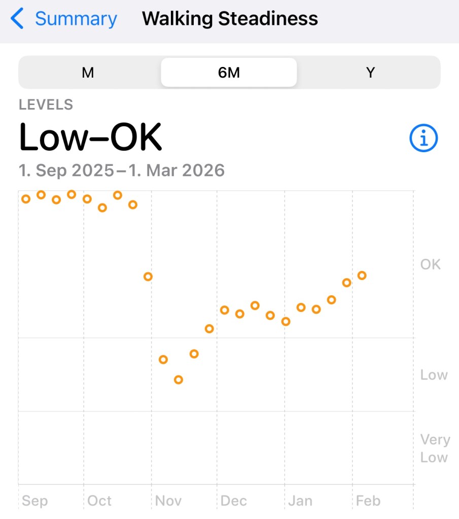 It’s also vaguely comforting to see my walking metrics slowly tending towards normality again – the 8k average step count will gradually creep up over the year, I expect, as I become capable of hikes, then running, etc.. – assuming no re-rupture, of course 😬 🙏 🤞.