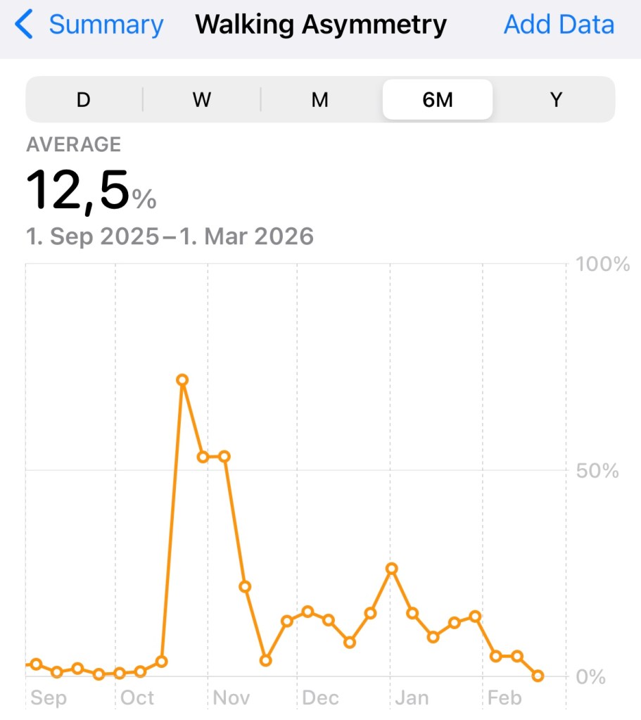 Anyway, although I’m still using them, I use them on kind of the ‘beat two’ of my gait, where ‘beat one’ is the heel strike of my affected foot and ‘beat three’ is the heel strike of my unaffacted foot; they thus simply compensate on toe-off e.g. for my heavy rucksack but _don’t negatively affect my gait_ (as shown by the iPhone gait asymmetry measurements!).